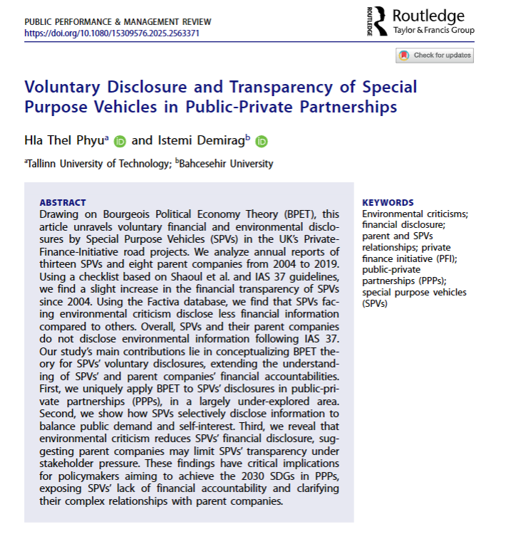 Prof. Dr. İstemi DEMİRAĞ's article titled "Voluntary Disclosure and Transparency of Special Purpose Vehicles in Public-Private Partnerships" has been published in the journal of Public Performance & Management Review!