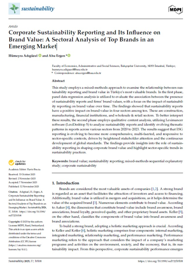The article titled "Corporate Sustainability Reporting and Its Influence on Brand Value: A Sectoral Analysis of Top Brands in an Emerging Market," written by Prof. Dr. Hümeyra Adıgüzel and Prof. Dr. Ahu Ergen, has been published in the journal Sustainability.