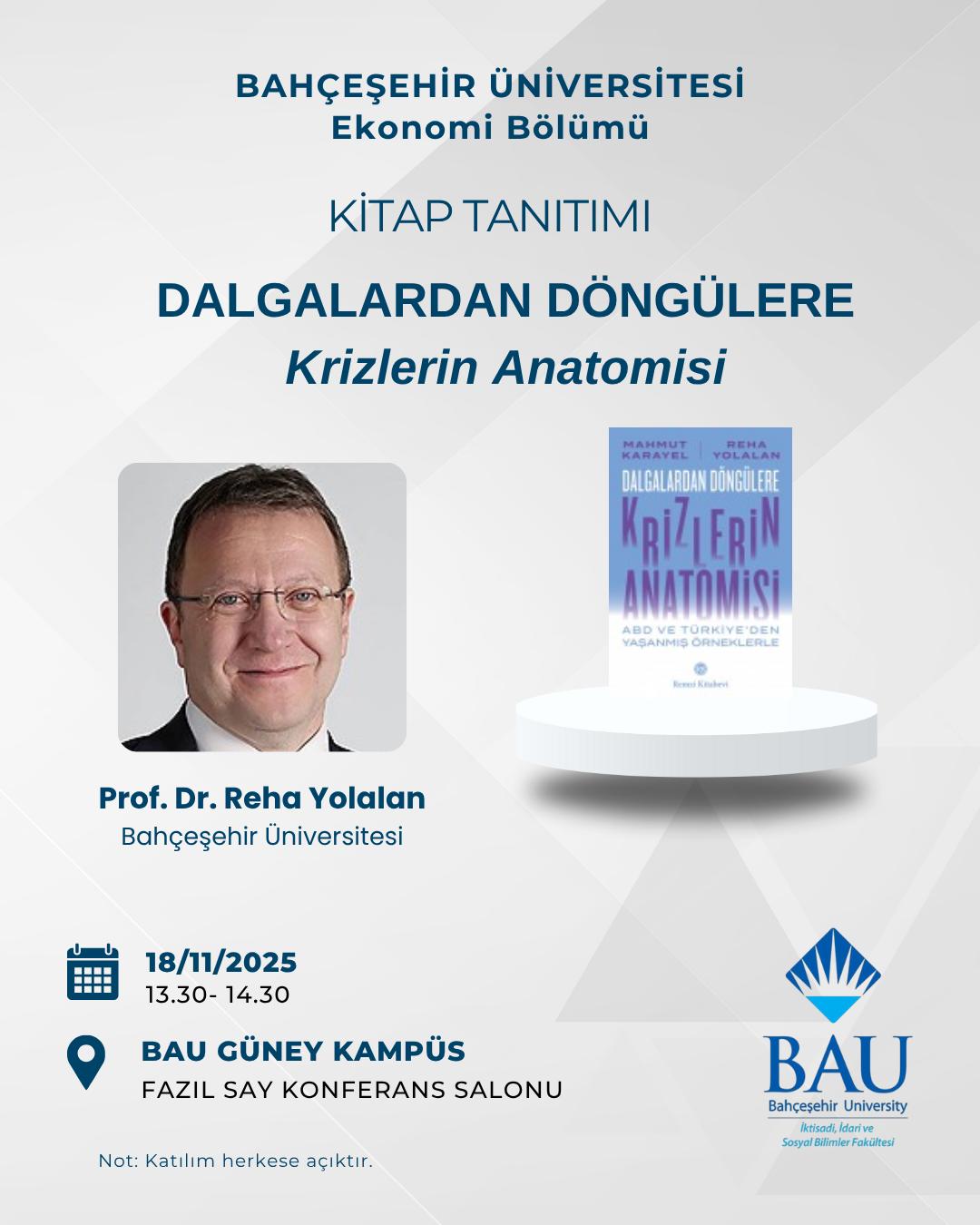 Bahçeşehir University Department of Economics hosted Prof. Dr. Reha Yolalan on November 18, 2025, for an event titled “Dalgalardan Döngülere: Krizlerin Anatomisi”. The conference, held at the BAU South Campus Fazıl Say Auditorium, featured a presentation based on Reha Yolalan's recently published book.