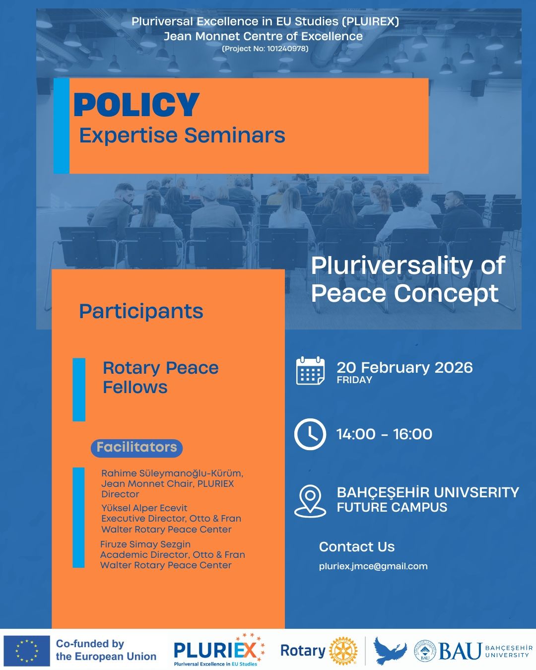 PLURIEX Policy Expertise Seminar: “Pluriversality of the Concept of Peace” with 2026 Rotary Peace Fellows Cohort The first Policy Expertise Seminar of the Pluriversal Excellence in EU Studies (PLURIEX) Jean Monnet Centre of Excellence at Bahçeşehir University was held on 20 February 2026 (14:00–16:00) at BAU Future Campus. The seminar brought together Rotary Peace Fellows from 17 countries — including Australia, Lebanon, Afghanistan, Pakistan, Brazil, Trinidad and Tobago, Slovenia, Yemen, Palestine, Turkmenistan, and China — creating a genuinely pluriversal dialogue space on contemporary peacebuilding. At a moment when Europe’s own historical experience continues to be widely interpreted as a peace project grounded in cooperation across difference, the seminar provided a timely platform to critically reflect on how peace is conceptualised, practiced, and contested across diverse global contexts. The cohort reflected an unusually rich concentration of senior practitioners, scholars, and policy professionals working across multiple peace- and development-relevant sectors. Participants included programme leaders managing large-scale public health and inclusion portfolios; education development specialists expanding equitable access to schooling; academic researchers in political science and anthropology; legal and human rights experts engaged in judicial reform processes; practitioners working on community-based prevention of violent extremism; refugee protection officers supporting housing, land and property rights and legal identity access; gender-based violence specialists delivering survivor-centred programming; monitoring and evaluation professionals strengthening evidence-based interventions; environmental campaign organisers mobilising grassroots advocacy; and social impact strategists advancing arts-based community resilience initiatives. Crucially, many fellows brought direct operational experience from conflict-affected, fragile, or structurally unequal settings. Others contributed policy, academic, and transnational advocacy perspectives. This multi-layered professional composition was not merely descriptive but epistemically consequential for the seminar design. It enabled the session to function as a genuinely dialogical space rather than a one-directional knowledge transfer exercise. The fellows’ situated and practice-based insights became a central analytical resource, supporting the collective exploration of more expansive and context-sensitive understandings of peace that extend beyond conventional policy frameworks and resonate strongly with PLURIEX’s commitment to epistemic plurality and cross-sector knowledge co-production. Reframing Peace Through Epistemic Justice The seminar opened with the PLURIEX conceptual framework, introducing epistemic injustice (Fricker, 2007) as a key lens for analysing power asymmetries in knowledge production. Particular attention was paid to testimonial injustice (credibility deficits) and hermeneutical injustice (interpretive gaps), and how these dynamics continue to shape whose knowledge counts in global governance and peacebuilding. Building on this foundation, the session engaged with the Decolonising the University literature and movements such as Rhodes Must Fall, which were discussed as forms of resistance against entrenched epistemic hierarchies. Participants collectively reflected on how similar patterns of exclusion may also structure dominant understandings of peace. A central proposition emerging from the seminar was that mainstream definitions of peace may themselves reproduce epistemic injustice. Participants collectively examined how mainstream peacebuilding frameworks often operate through: • technocratic universalism • externally imposed policy templates • elite-driven negotiation formats • insufficient engagement with local epistemologies In this respect, the workshop argued that peace studies itself requires epistemic pluralisation and decolonisation. The presence of Rotary Peace Fellows from highly diverse geopolitical and socio-cultural contexts — as well as from a wide range of professional fields and thematic areas of expertise — was therefore not incidental but methodologically integral to the event design. Their participation operationalised PLURIEX’s commitment to multiple standpoints, epistemic plurality, epistemic diversity, and cross-regional knowledge co-production. This multidimensional diversity created what the seminar conceptualised as a living pluriversal classroom, where peace was examined as a situated and contested concept rather than a universal given. Interactive Dialogue: Surfacing Visible and Invisible Peaces During the brainstorming and mapping exercises, participants reflected on what peace looks like in their own contexts and who has the authority to define it. Group discussions focused on silenced or invisible peace. The discussions revealed strong cross-regional convergence around the idea that many locally embedded, gendered, and minority peace practices remain structurally under-recognised within formal peace architectures. Participants repeatedly emphasised that dominant peace narratives tend to privilege the perspectives of elite decision-makers, international organisations, and powerful global actors, while the experiences of women, minorities, and marginalised communities are often rendered invisible. Through scenario-based discussion, fellows identified multiple contemporary manifestations of epistemic injustice in peacebuilding, including: • international NGOs entering post-conflict settings with ready-made models • women’s informal mediation being overlooked in formal negotiations • indigenous conflict resolution practices being labelled merely “traditional” and sidelined These exchanges reinforced the need to rethink peacebuilding through more context-sensitive and epistemically inclusive frameworks. The session concluded by opening a forward