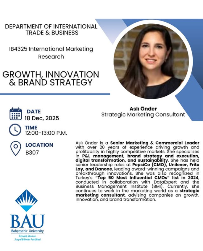 Kıdemli pazarlama yöneticisi Aslı Önder, bugün Uluslararası Pazarlama Araştırmaları dersimizde öğrencilerimizle deneyimlerini paylaştı. Küresel şirketlerdeki liderlik yolculuğundan yola çıkarak, stratejik düşünme, marka dönüşümü ve pazarlamada uzun vadeli etki yaratma konularında değerli içgörüler sundu.