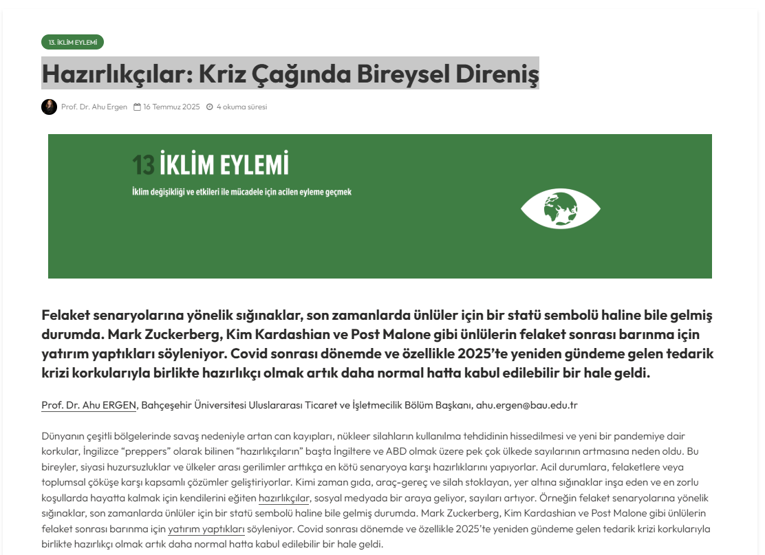 Prof. Dr. Ahu Ergen’in "Hazırlıkçılar: Kriz Çağında Bireysel Direniş'' başlıklı köşe yazısı Türkiye’nin ilk karbon nötr dergisi EKOIQ'da yayımlandı.