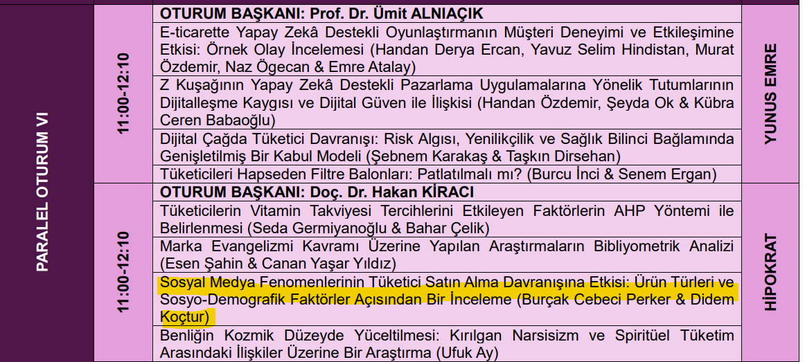 8–11 Ekim 2025 tarihleri arasında Muğla Sıtkı Koçman Üniversitesi Fethiye İşletme Fakültesi ev sahipliğinde düzenlenen 28. Pazarlama Kongresi’ne, Dr. Öğr. Üyesi Burçak Perker “Sosyal Medya Fenomenlerinin Tüketici Satın Alma Davranışına Etkisi: Ürün Türleri ve Sosyo-Demografik Faktörler Açısından Bir İnceleme” başlıklı çalışmasıyla katkı sağlamıştır.