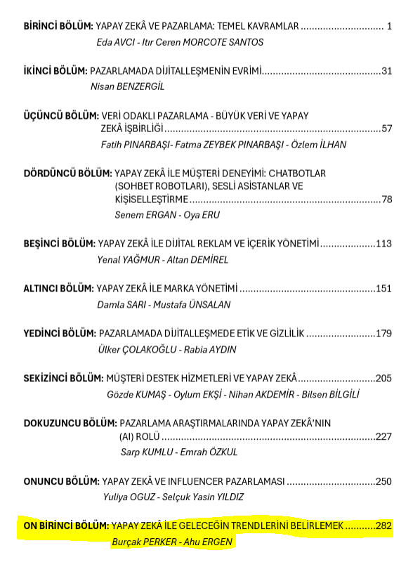 Editörlüğünü Sayın Prof. Dr. Erdoğan Koç, Sayın Doç. Dr. Gökhan Akel ve Sayın Doç. Dr. Ahu Yazıcı’nın üstlendiği, pazarlama alanında dijital dönüşüm ve yapay zekâ uygulamalarını kapsamlı biçimde ele alan Pazarlamada Dijitalleşme ve Yapay Zekâ adlı kitapta; öğretim üyelerimiz Dr. Öğr. Üyesi Burçak Perker ve Prof. Dr. Ahu Ergen, 11. bölüm ile katkı sağlamışlardır.
