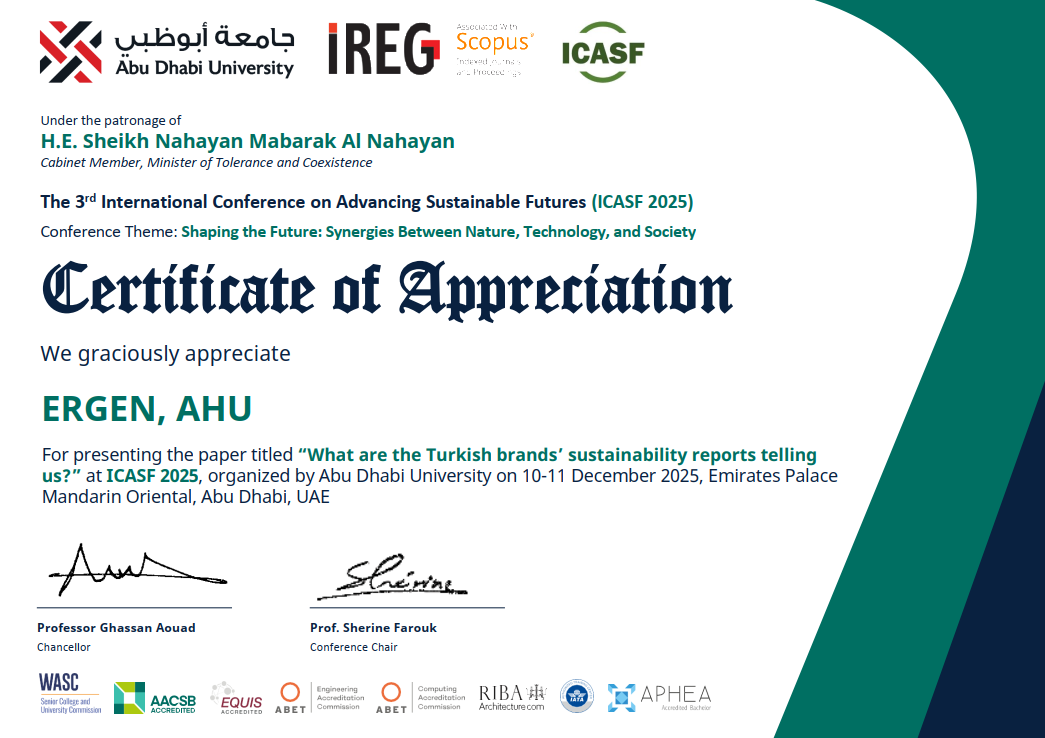 Uluslararası Ticaret ve İşletmecilik Bölümü’nden Prof. Dr. Ahu Ergen, Abu Dhabi University ev sahipliğinde düzenlenen The 3rd International Conference on Advancing Sustainable Futures (ICASF 2025)’a katıldı.