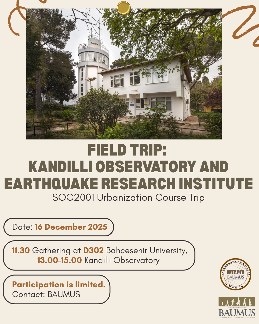📅 16 Aralık: BAUMUS ekibi ve SOC2001 dersi öğrencileri ile birlikte Kandilli Rasathanesi’ni ziyaret ediyoruz. Deprem Araştırma Enstitüsü ev sahipliği ile depremin oluşumu ve ölçümü gibi teknik süreçleri yerinde gözlemleyerek deprem olgusuna dair kavrayışımızı geliştireceğiz. (Katılım sınırlıdır. Kayıt ve bilgi için lütfen BAUMUS hesabıyla iletişime geçin.)