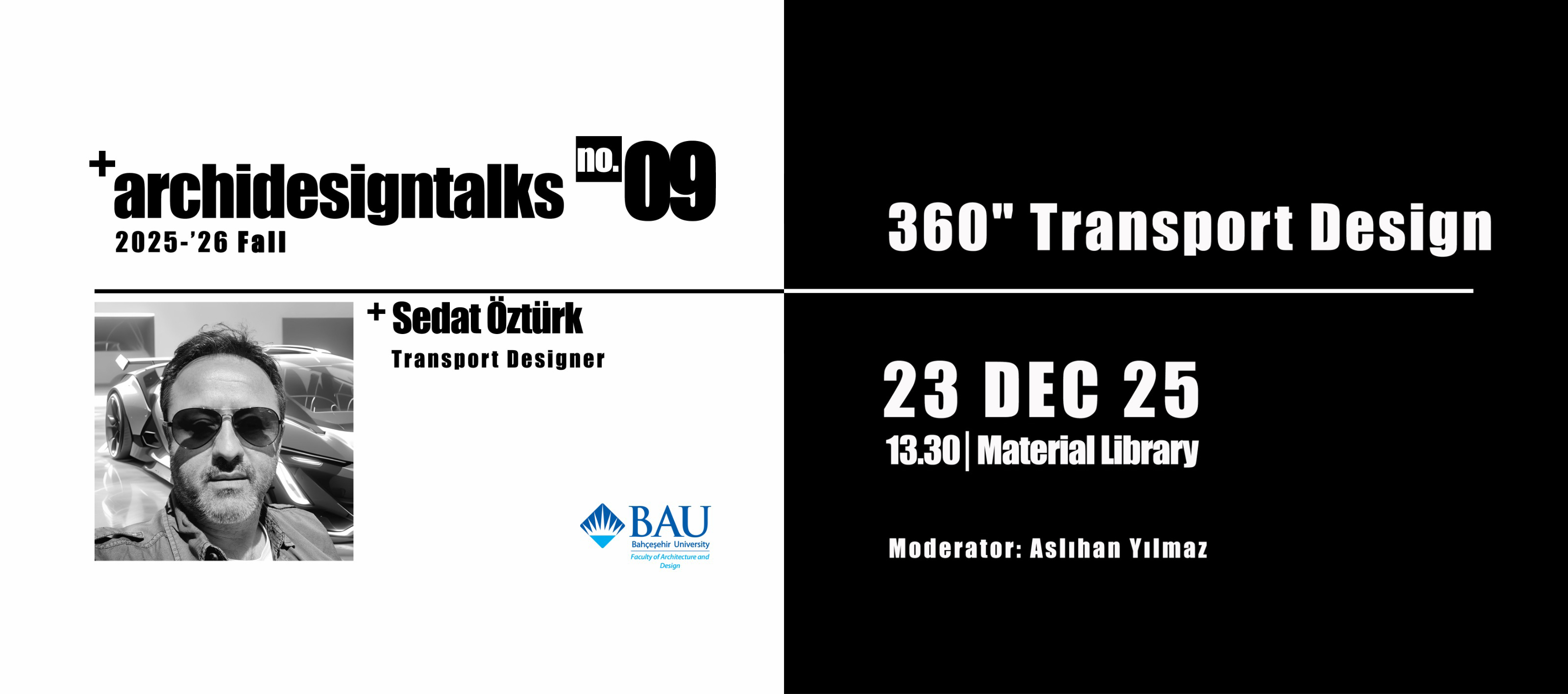 23 Aralık 2025 Salı günü, BAU Kuzey Kampüs B Blok 2. kat Material Library’de, “360° Ulaşım Tasarımı” başlıklı konuşmada Sedat Öztürk’ü ağırlayacağız. Oturumun moderatörlüğünü Aslıhan Yılmaz üstlenecektir.
