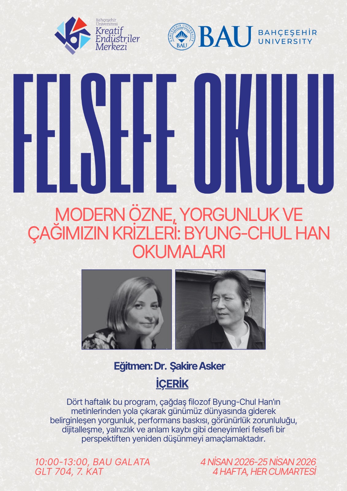 Dr. Şakire Asker yürütücülüğünde gerçekleşecek "Modern Özne, Yorgunluk ve Çağımızın Krizleri: Byung-Chul Han Okumaları", performans baskısı ve görünürlük zorunluluğu altında zayıflayan anlam duygusunu incelemeyi hedefliyor.