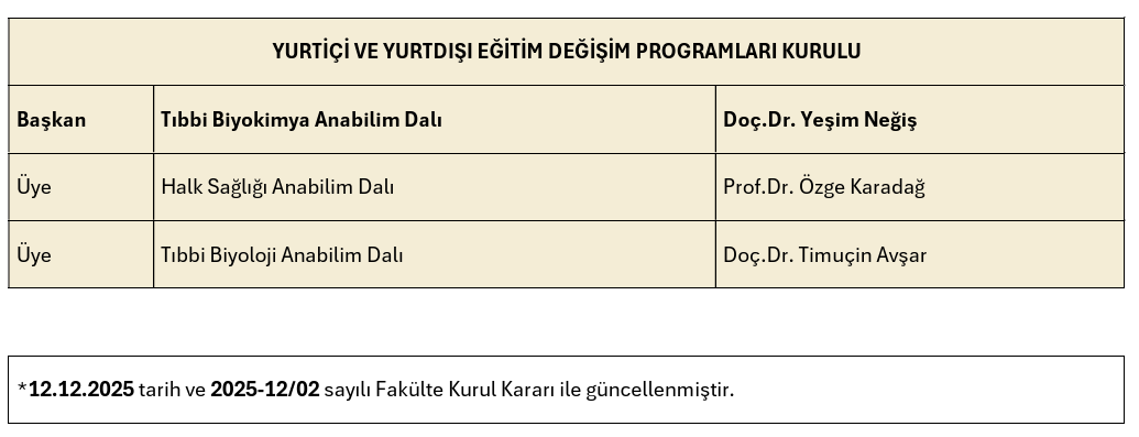 Yurt İçi ve Yurt Dışı Eğitim Değişim Programları Kurulu, mezuniyet öncesi tıp eğitimi gören öğrencilerin bilgi ve becerilerini artırmak amacıyla katılacakları yurt içi ve yurt dışı eğitim programları ile ilgili başvuruları değerlendirir. Kurul değerlendirme sonucu önerilerini Fakülte Yönetim Kuruluna sunulmak üzere Dekanlığa iletir. Öğrencilerin kurum dışından alacakları derslerin fakültemizde geçerli sayılabilmesi için Fakültemiz müfredatı ile uyumlu olması şartı aranır, bu amaçla kurul gerektiğinde Anabilim Dallarının görüşlerine başvurarak karar almaktadır.