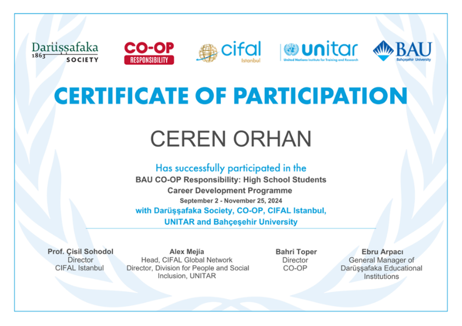 The programme is organized by Bahçeşehir University in collaboration with CIFAL Istanbul, a training and research center affiliated with the United Nations Institute for Training and Research (UNITAR). Upon completion, participants receive BAU–UNITAR-approved certificates, formally recognizing their achievements and engagement in a university-level learning experience.
