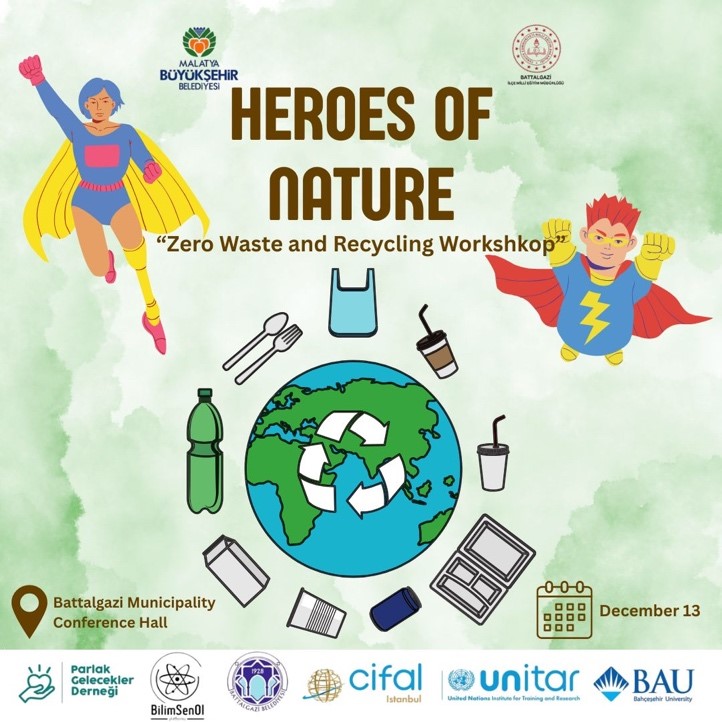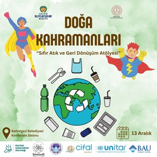 The image below shows the poster of the ‘Heroes of Nature: Zero Waste and Recycling Workshop’ organized in Malatya within Bahcesehir University’s training program in the earthquake region.