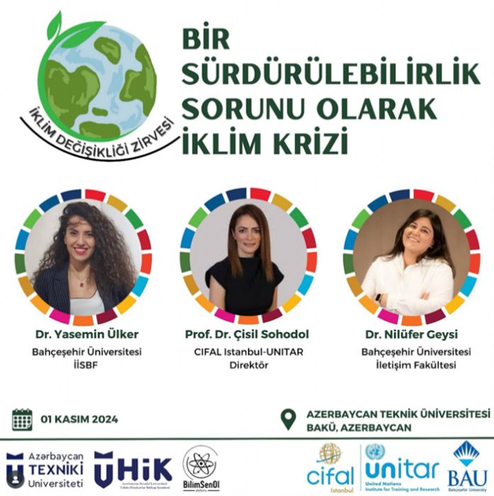 Bahcesehir University, through its CIFAL Istanbul Centre affiliated with the United Nations Institute for Training and Research (UNITAR), co-organized the “Climate Change Summit: The Climate Crisis from a Sustainability Perspective” in collaboration with Azerbaijan Technical University, the Young Researchers Innovation Club, and BilimSenOl. The summit took place at Azerbaijan Technical University in Baku, exemplifying Bahçeşehir University’s commitment to extending its academic and sustainability initiatives beyond national borders.