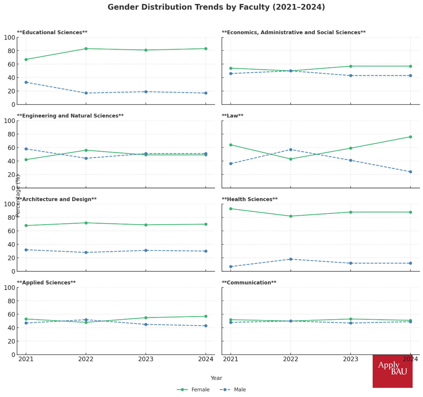 Through the ApplyBAU digital platform, Bahçeşehir University systematically monitors gender representation across faculties to ensure that both application and scholarship processes support gender equality. Between 2021 and 2024, the University has consistently tracked female applicants’ scholarship application and award success rates, using this data to inform evidence-based revisions to admission and financial aid policies.