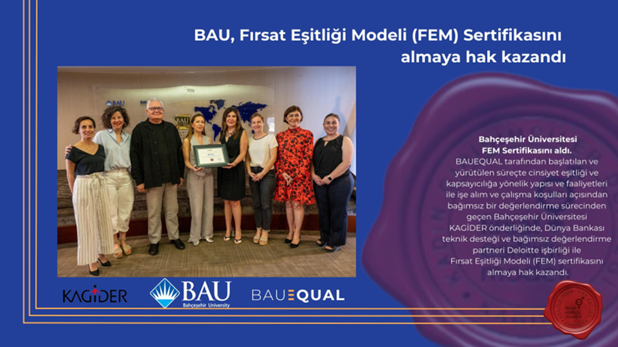 BAU has been officially recognized as an “Equal Opportunity Model (FEM)” Certified University, a distinction developed and implemented by the Women Entrepreneurs Association of Türkiye (KAGİDER) with the support of the World Bank. This certification affirms BAU’s strong institutional commitment to promoting gender equality, diversity, and women’s empowerment in education and employment.