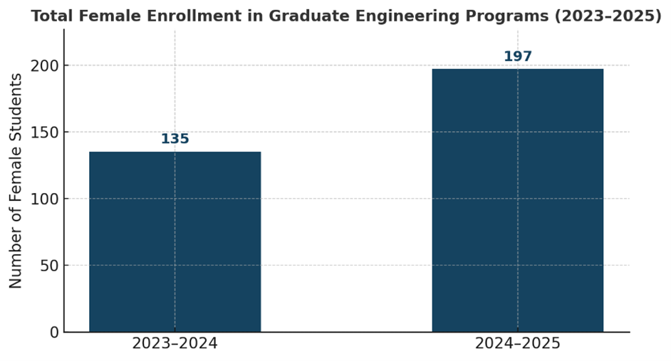 In the last two years, the total number of female students enrolled in graduate engineering programs increased markedly from 135 to 197. This steady growth demonstrates BAU’s success in encouraging women to pursue advanced studies in engineering and related STEM fields.