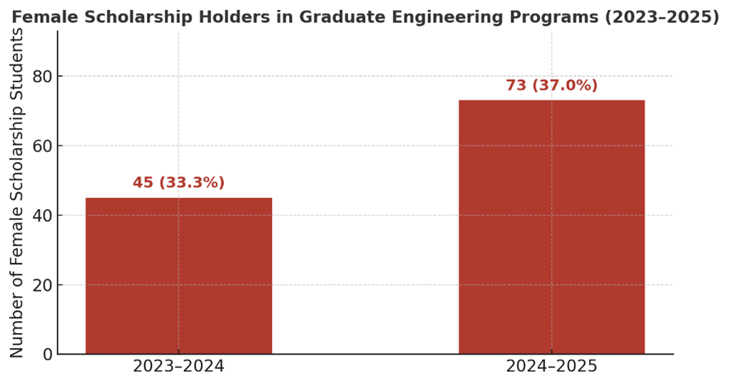 Similarly, the number of female scholarship recipients in these STEM programs rose from 45 (33.3%) in 2023–2024 to 73 (37.0%). This upward trend indicates not only higher enrollment but also improved access to financial aid mechanisms designed to support women in technical and scientific disciplines.