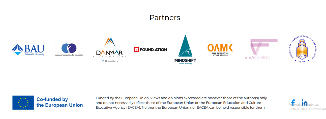The Future Women Project is an international research and best practice development initiative, supported by the European Union’s Erasmus+ Programme, The project is implemented in partnership with Bahçeşehir University (Türkiye), Business Foundation for Education (Bulgaria), Danmar Computers (Poland), Found.ation (Greece), Mindshift Talent Advisory (Portugal), Oulu University of Applied Sciences (Finland), VivaFemina (Poland), and the University of Chemical Technology and Metallurgy (Bulgaria).