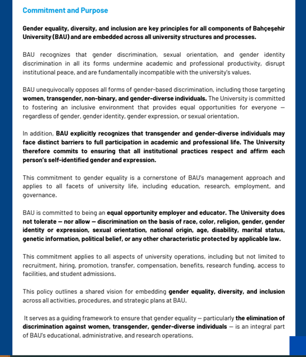 Bahçeşehir University Non-Discrimination, Harassment, and Retaliation Prevention Policy can be accessed through the following link.