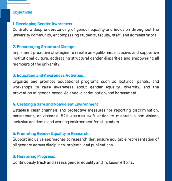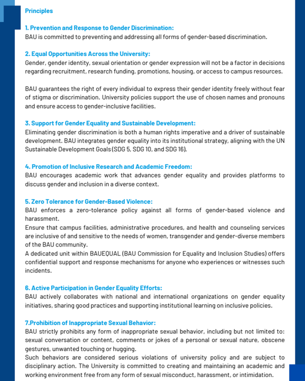 Following this declaration, a working group of experts established the BAU Commission for Equality and Inclusion Studies (BAUEQUAL) in October 2020, with a mission to develop an egalitarian, inclusive, and non-violent campus and workplace.