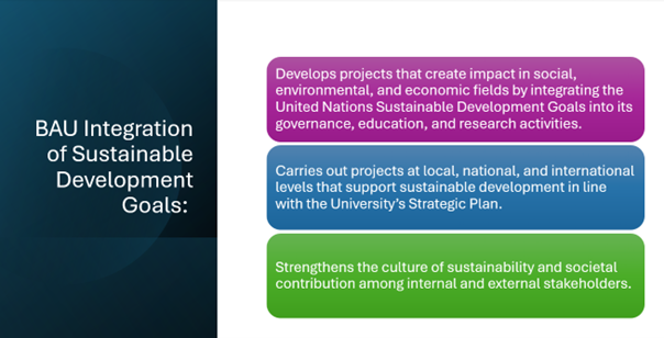 This comprehensive approach ensures that sustainability is not treated as a separate agenda but as a foundational value guiding every aspect of the university’s strategy, operations, and decision-making processes. Through this integration, BAU demonstrates its dedication to cultivating a culture of responsibility, innovation, and inclusivity within both the academic community and society at large.