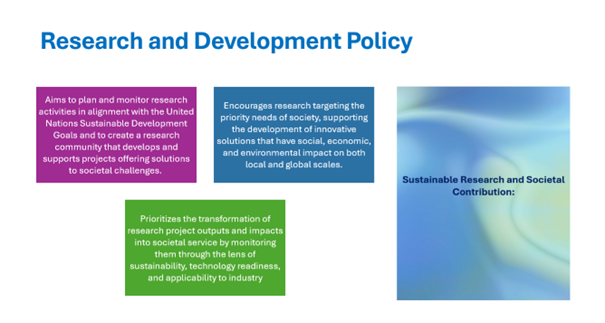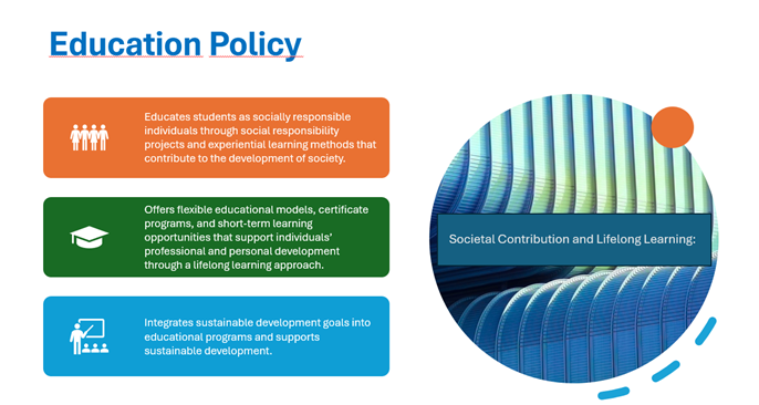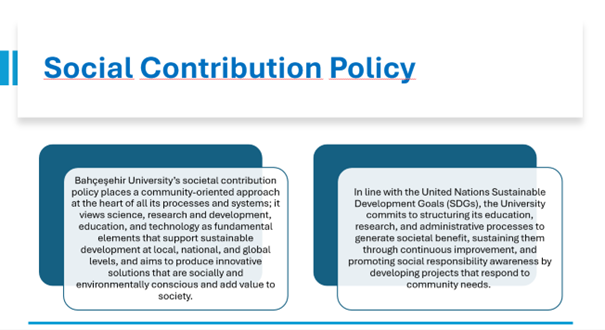 The images below show how Bahcesehir University integrates sustainable development principles into its main institutional policies, including education, research and development, social impact, and governance.