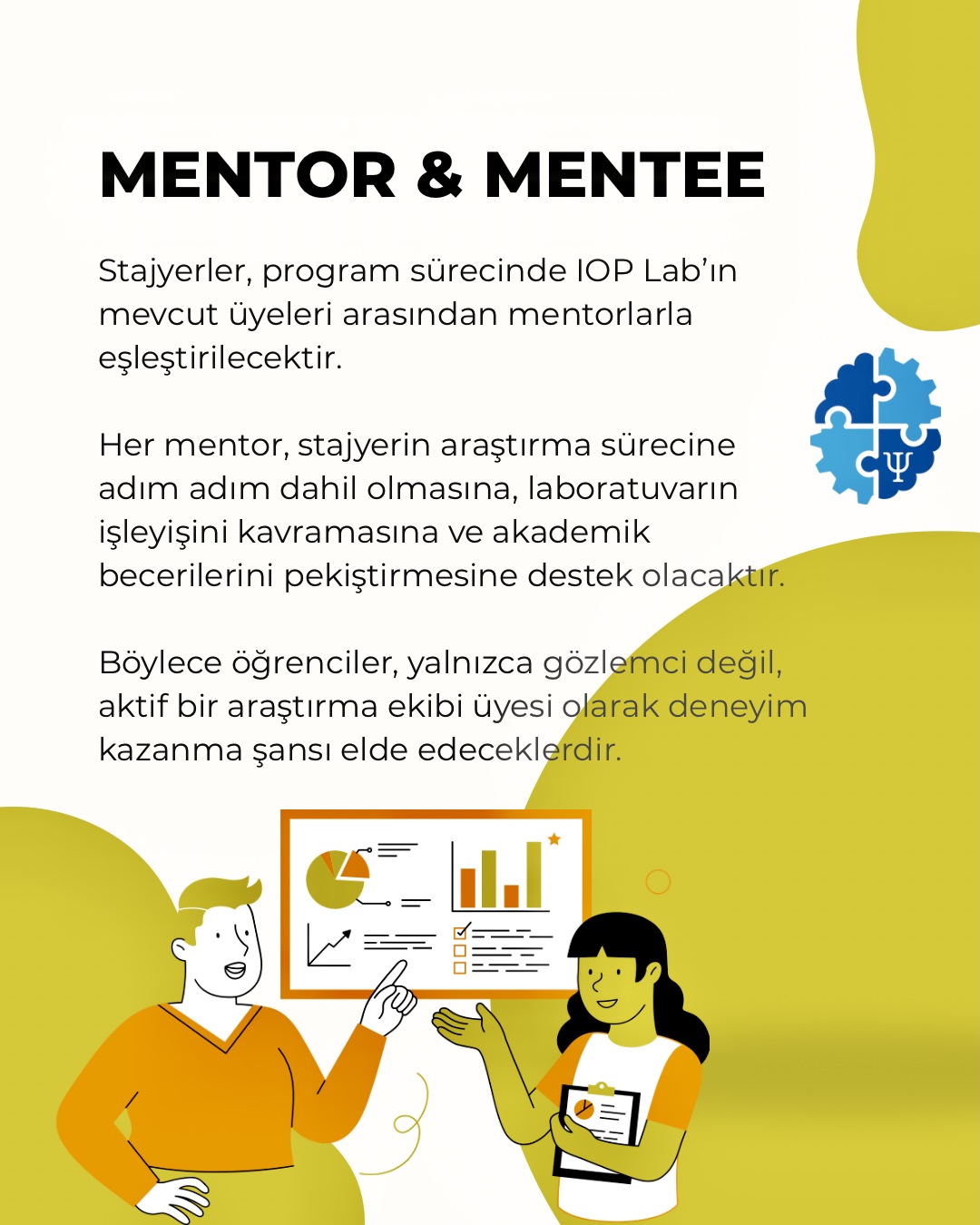 Program, Bahçeşehir Üniversitesi Psikoloji Bölümü 3. ve 4. sınıf öğrencilerine yöneliktir ve öğrencilerin akademik araştırma süreçlerine aktif katılımını desteklemeyi amaçlamaktadır. Stajyerler, laboratuvar çalışmaları kapsamında literatür taraması, veri analizi, araştırma raporlaması ve benzeri akademik görevlerde yer alacaklardır. Program süresince katılımcıların araştırma becerileri, sorumluluk bilinci ve ekip çalışması yetkinlikleri değerlendirilecektir. Değerlendirme aşamasını başarıyla tamamlayan stajyerler, IOP Lab’ın üyesi olarak araştırma projelerinde görev alma ve akademik üretim süreçlerine doğrudan dahil olma fırsatı elde edeceklerdir.