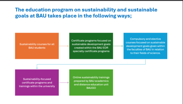 Within this framework, BAU has adopted a university-wide educational model that embeds sustainability across all disciplines, incorporating both theoretical and practical components at undergraduate and postgraduate levels in accordance with international standards. The approach ensures that every student—regardless of their field of study—engages meaningfully with sustainability principles and their real-world applications.