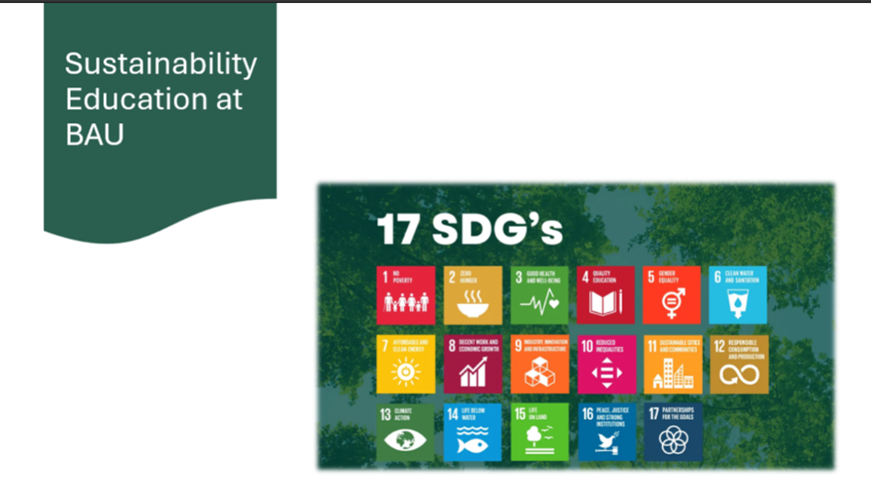 To cultivate sustainability awareness and inspire behavioral change among students, BAU systematically integrates SDG-related courses into its curriculum. These courses are designed not only to enhance knowledge but also to encourage students to adopt a sustainability mindset and to act as responsible global citizens. By linking classroom learning with community engagement and applied projects, BAU fosters a culture where sustainability is a daily practice—on campus and beyond.