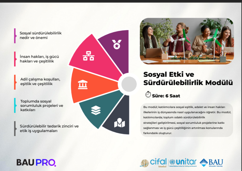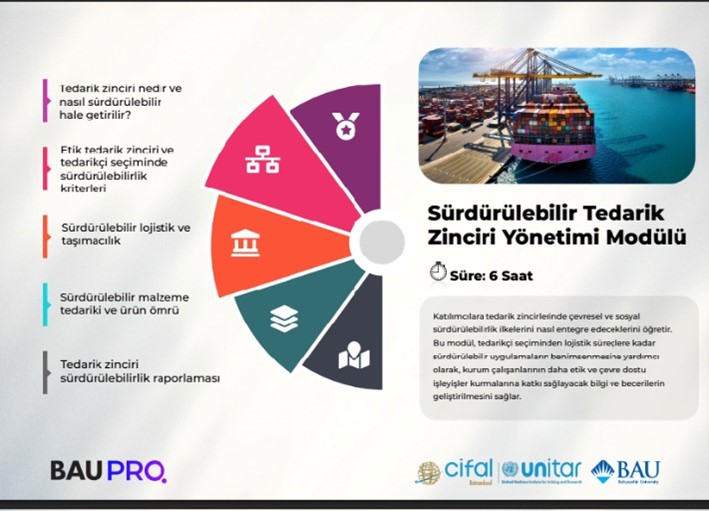 Sustainability-oriented training programs developed by Bahçeşehir University faculty members and the university’s Distance Education Unit (BAUGO) aim to enhance students’ awareness and understanding of sustainability. The program is conducted annually through the collaboration of BAU, CIFAL Istanbul, and the United Nations Institute for Training and Research (UNITAR). Each year, the courses determined within the scope of the program are offered free of charge to BAU students. Participants who successfully complete all course requirements are entitled to receive an official certificate, demonstrating their competence and commitment to sustainability education.