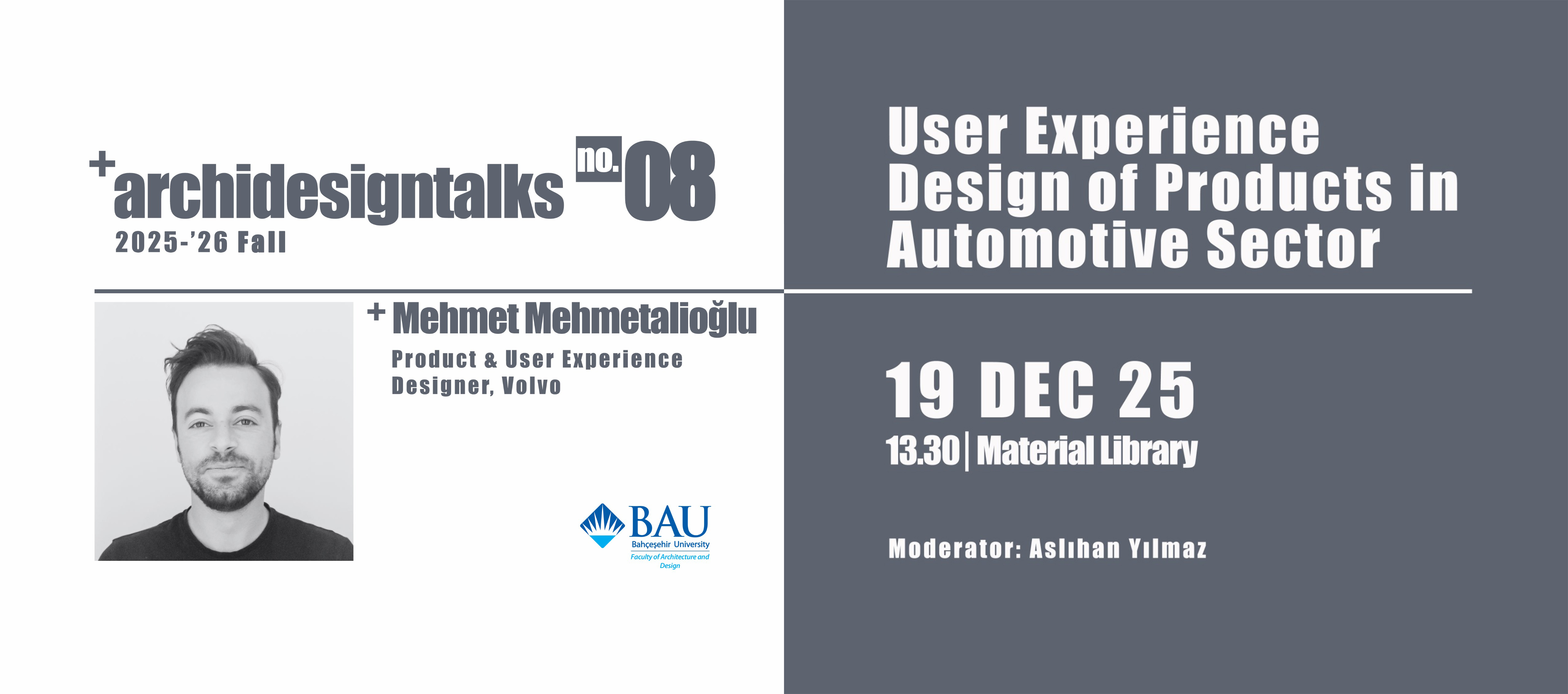 On Friday, 19 December 2025, we will host the talk “User Experience Design of Products in Automotive Sector” with Mehmet Mehmetalioğlu at BAU North Campus, B Block, 2nd floor – Material Library. The session will be moderated by Aslıhan Yılmaz.